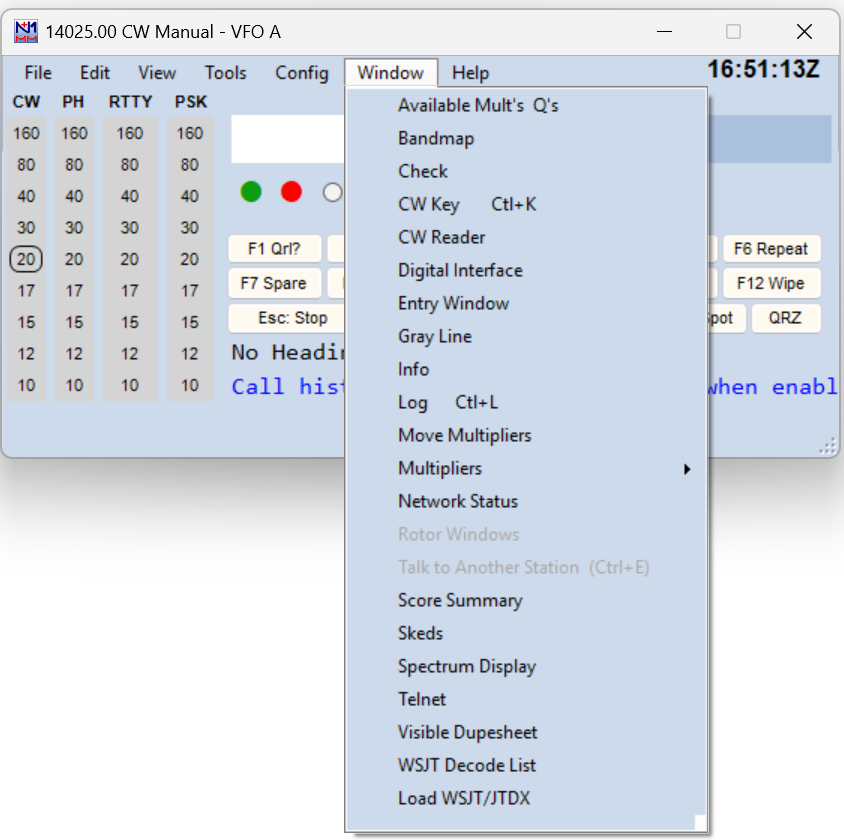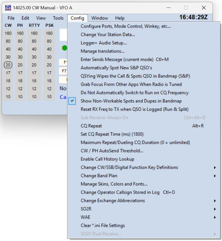 - Bandmap – Display the Bandmap window. In SO2R/SO2V each Entry window has its own Bandmap window. More info in the Bandmap Window chapter