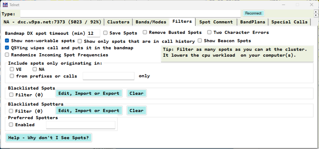 The filtering capabilities of the cluster node are usually more powerful and flexible. Using them also reduces telnet traffic and the processing load on your computer’s CPU by limiting the number of spots sent to your computer from the cluster node. Generally, we recommend that you use the spot filtering at your chosen Telnet cluster where possible.