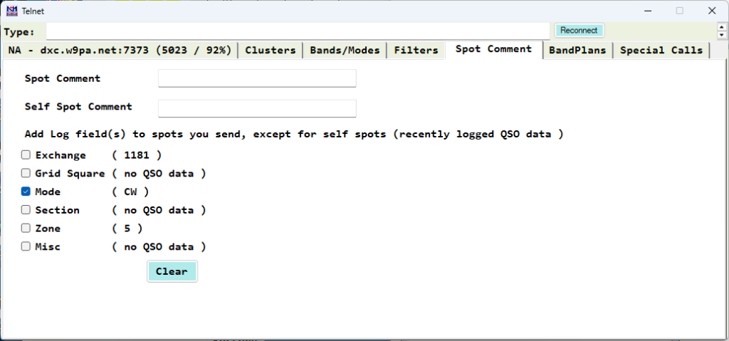 This tab lets you specify a comment for each spot you make (such as “WPX”) and add log data fields to the fixed comment.